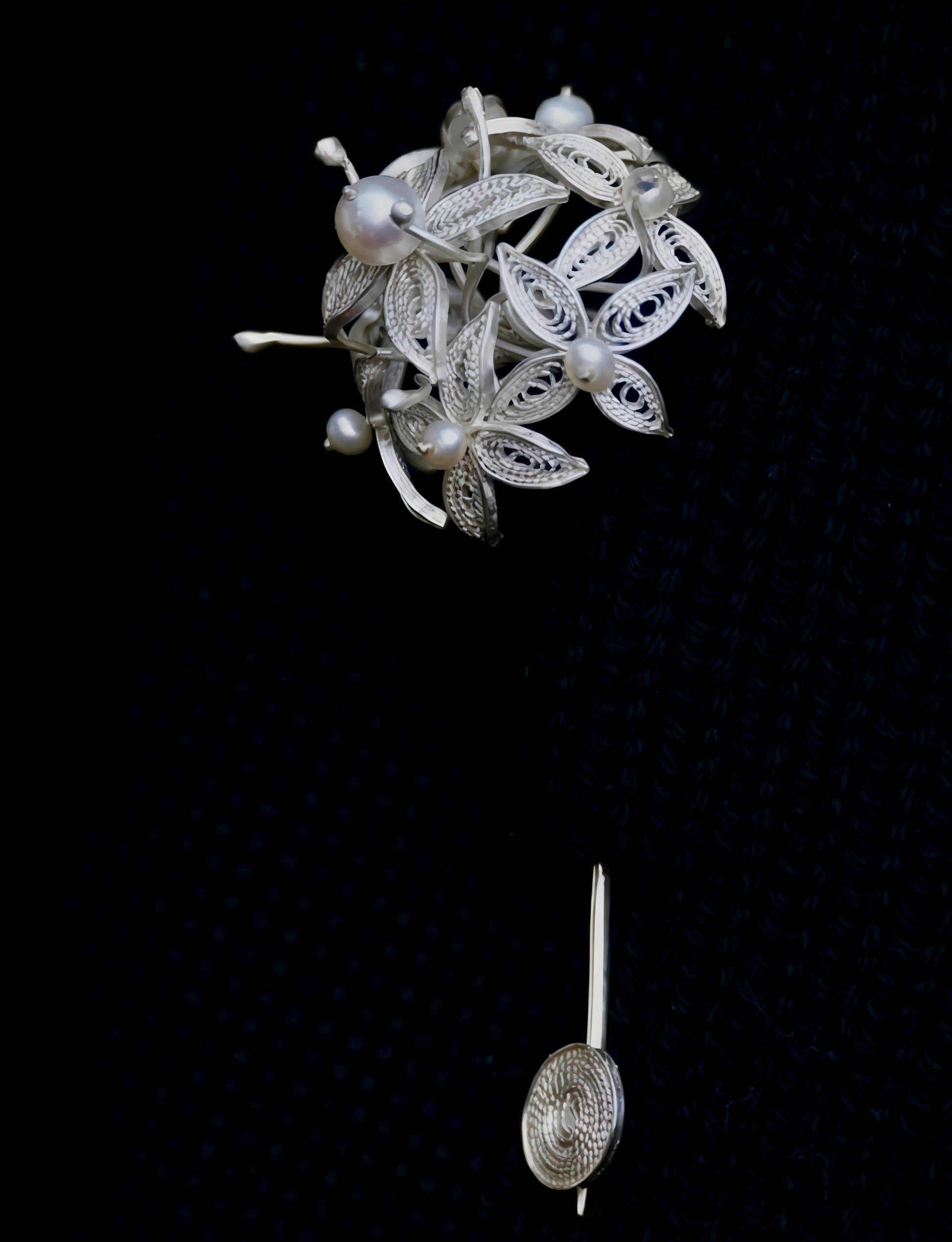 Inspired by dewy blooms in morning mist: filigree weaves openwork veins, layered 3D petals. Pearls like dew nestle or dangle. The rounded brooch captures flowers embracing dew, holding dawn’s vitality to tremble at the collar.
